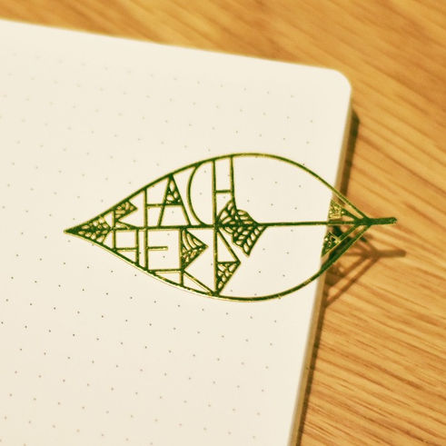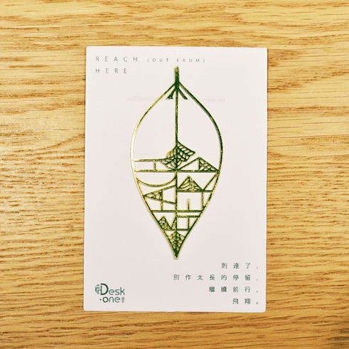 A leaf-shape was designed for this bookmark because leaf is a symbol that represents each Desk-one's customers who grow up from the learning place of Desk-one. Also, a sentence "REACH (OUT FROM) HERE" is hidden in the design. The bookmark would show "REACH HERE" when people insert the bookmark on a page, so the bookmark design would literally express the meaning of "REACH HERE" when people really "reach" a page. Moreover, the bookmark would literally show "REACH OUT FROM HERE" when people take it off and step forward to next page. In summary, the key message of this bookmark is that you should step forward to next page and never stay at a point for too long after arrived.